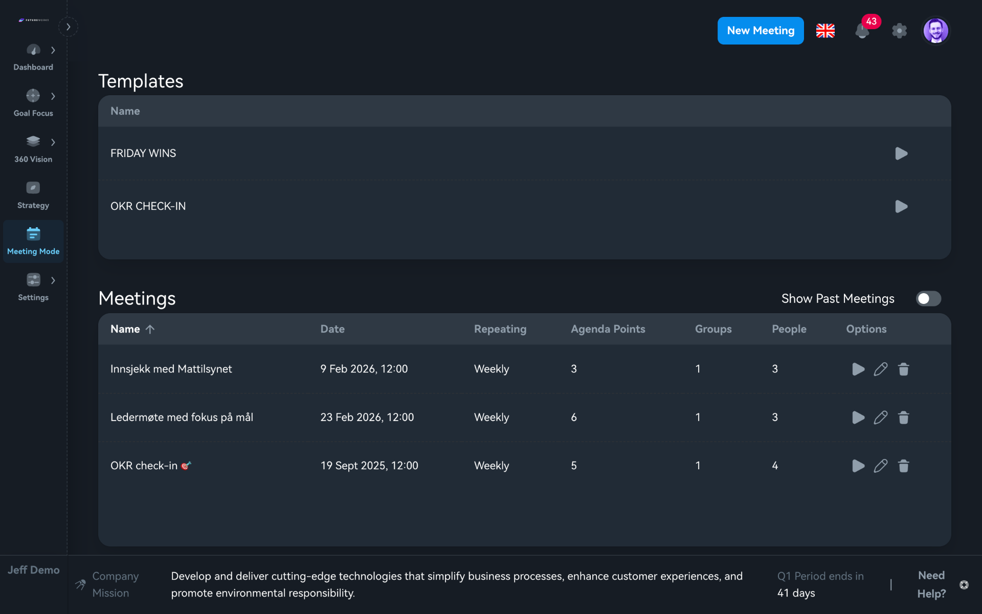 Choose a template, OKR Check-In, Friday Wins, and launch. Each agenda point is timed. Each participant gets their spotlight for Good News, OKR status, and actions. Recurring check-ins go from chaotic catch-ups to focused, time-boxed sessions.