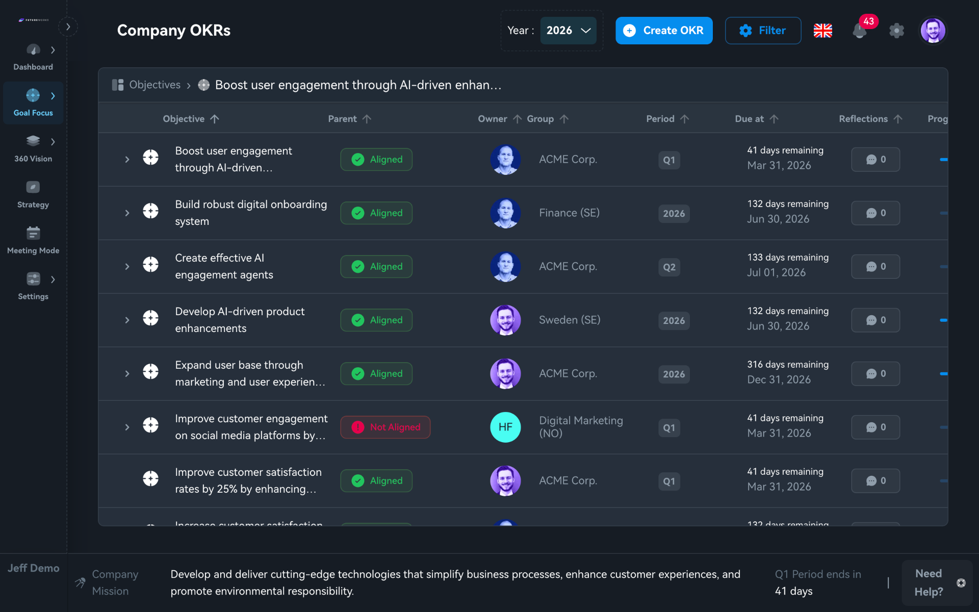 Leaders get a full-company OKR table showing alignment status, owners, periods, and due dates. Spot unaligned objectives in seconds. Filter by group or period. Drill into any objective to see key result detail.
