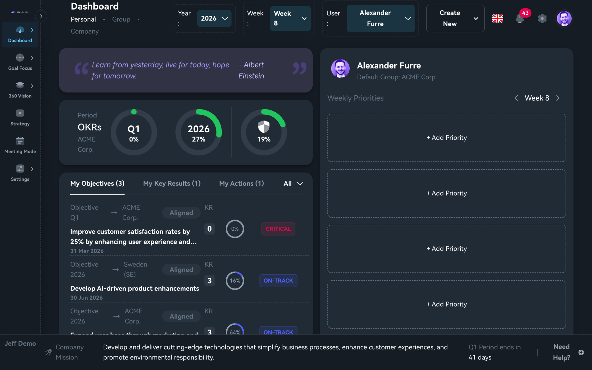 Every team member opens to their own dashboard, with progress rings for the quarter and the year, priorities for the week, and a live view of every objective with status and KR counts. No clicking around. No guessing where things stand.