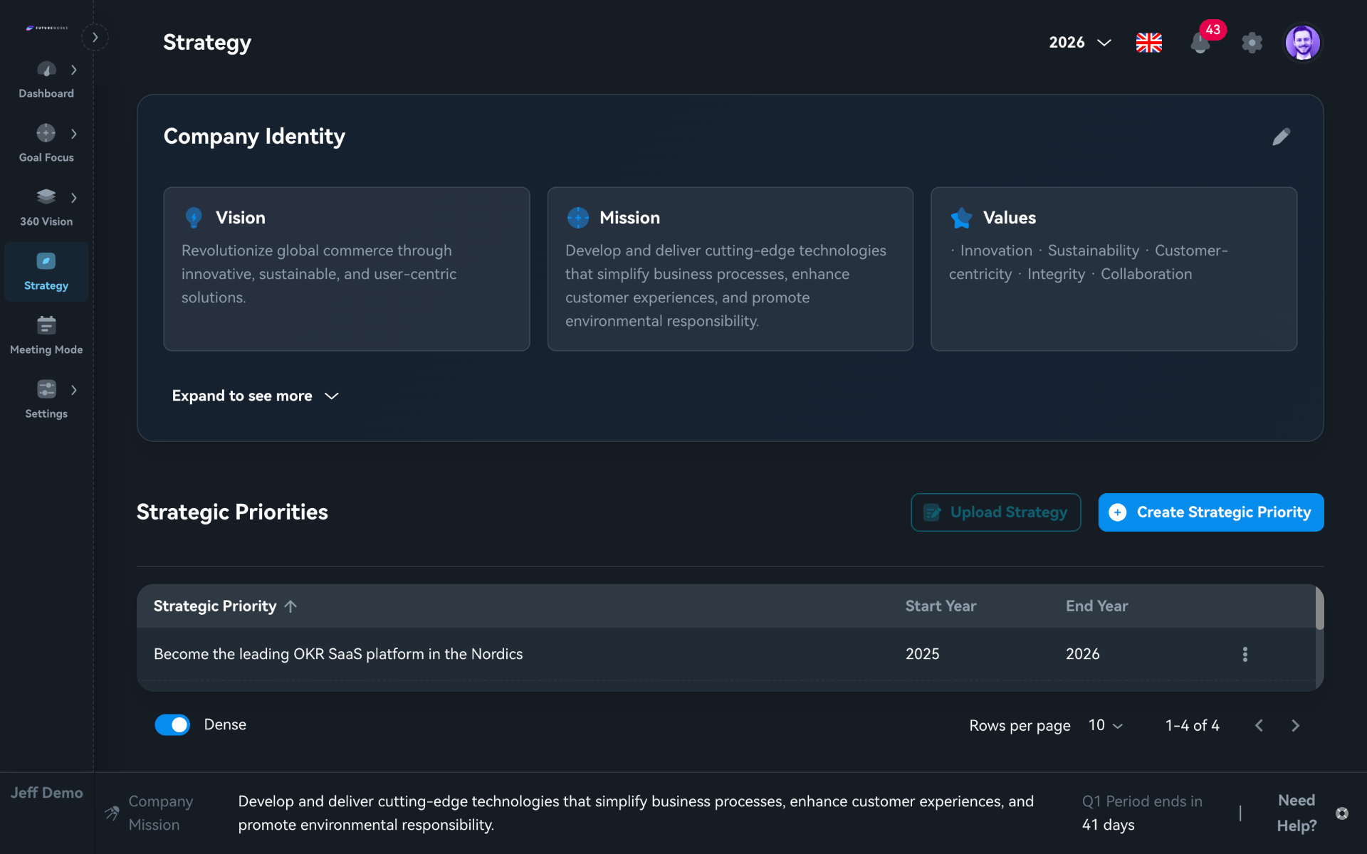 Strategy fails when it lives in a PDF no one opens. In Futureworks, Vision, Mission, and Values sit in three cards every employee can see. Build multi-year Strategic Priorities and connect them directly to the OKRs your teams set each quarter.